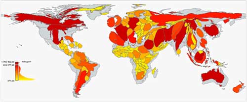 Se localmente isso ocorre, como seria em relação aos continentes, aos países? Pois um instituto francês que acompanha a mídia fez um levantamento e transformou isso em um mapa mundial com cores que representam quais os países que são mais abordados na mídia – que inclui, neste caso, também os blogs.